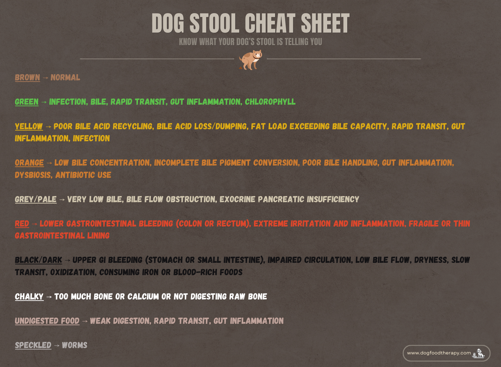 There is a lot of overlap in terms of what the color of your dog's stool means. Context and assessing all of your dog's symptoms and patterns is just as important as identifying the color. However, color is oftentimes closely tied to liver/gallbladder function, digestive strength and gut health.