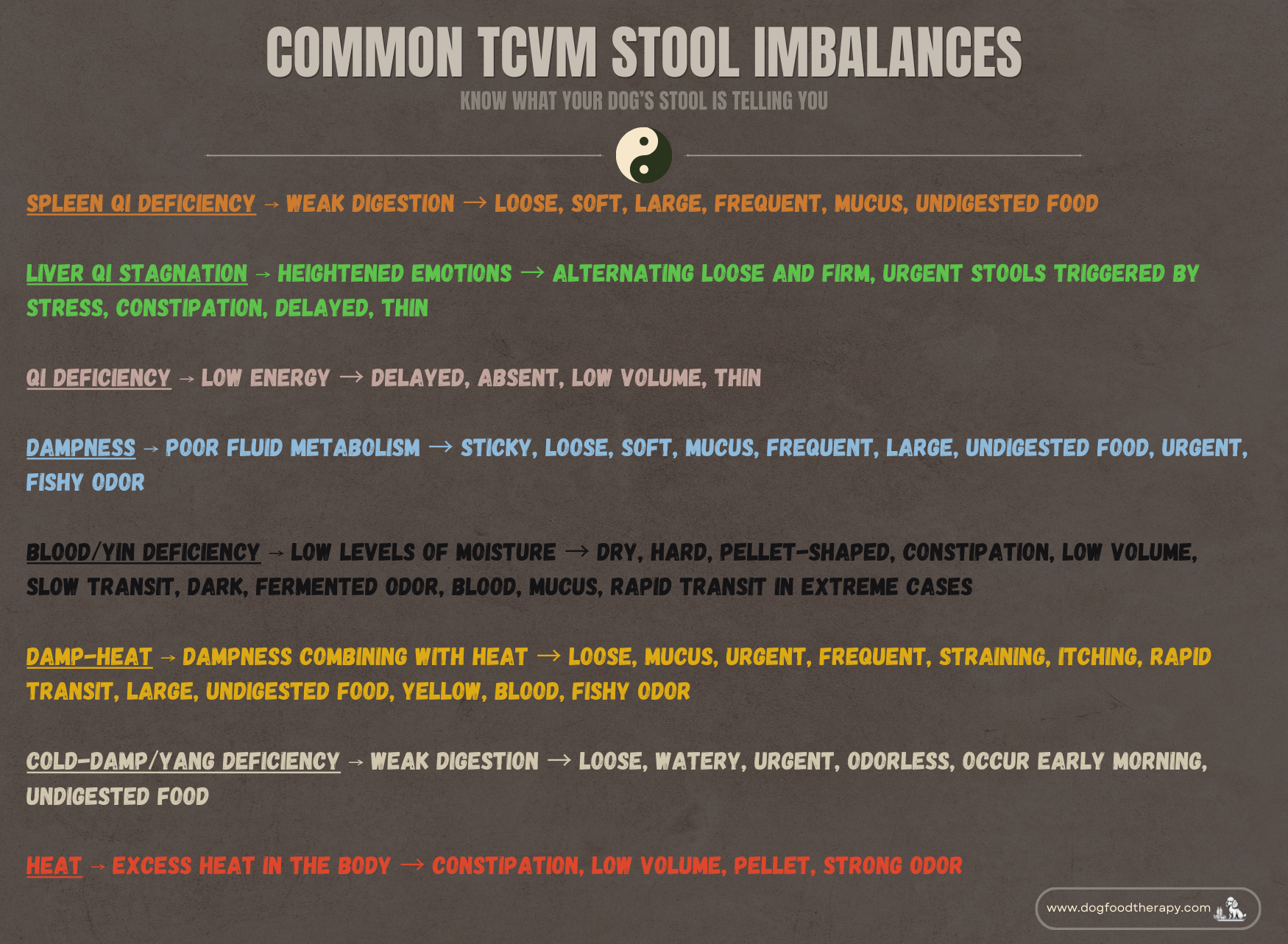 Once you have identified the root cause of your dog’s stool irregularities, you can utilize TCVM food and herbal therapy to build a diet and protocol that supports their tendencies and balances their system.